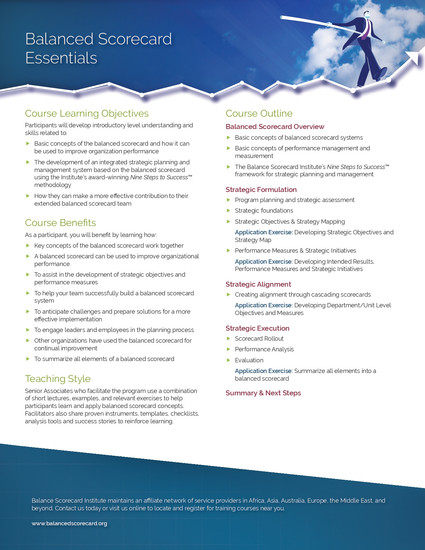 Balanced Scorecard Essentials is a one-day interactive experience designed to help balanced scorecard team members contribute to their organization’s strategic management and performance improvement initiatives.